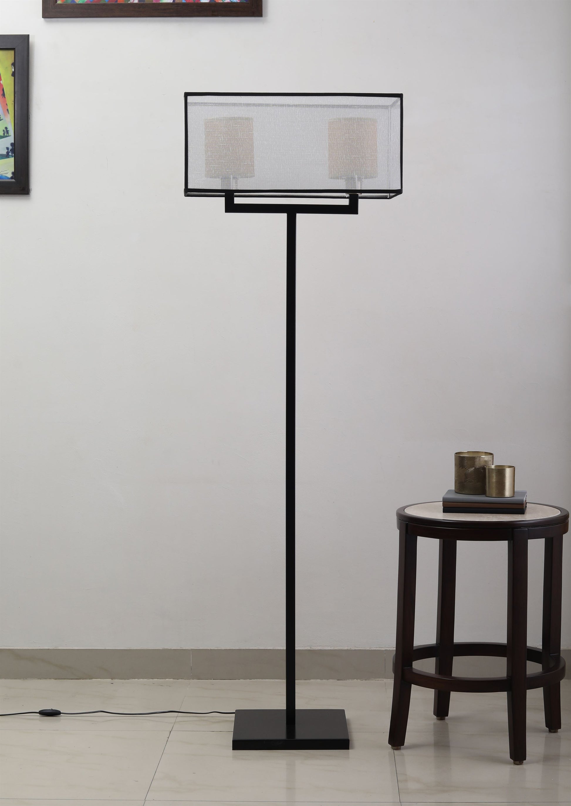 A beautiful blend of design & style, this floor lamp lamp is gorgeous & modern with two white cylindrical shades shrouded behind a rectangular mesh parchment shade. A must-have for classy homes!