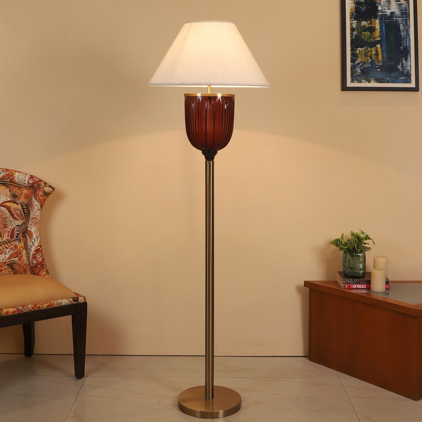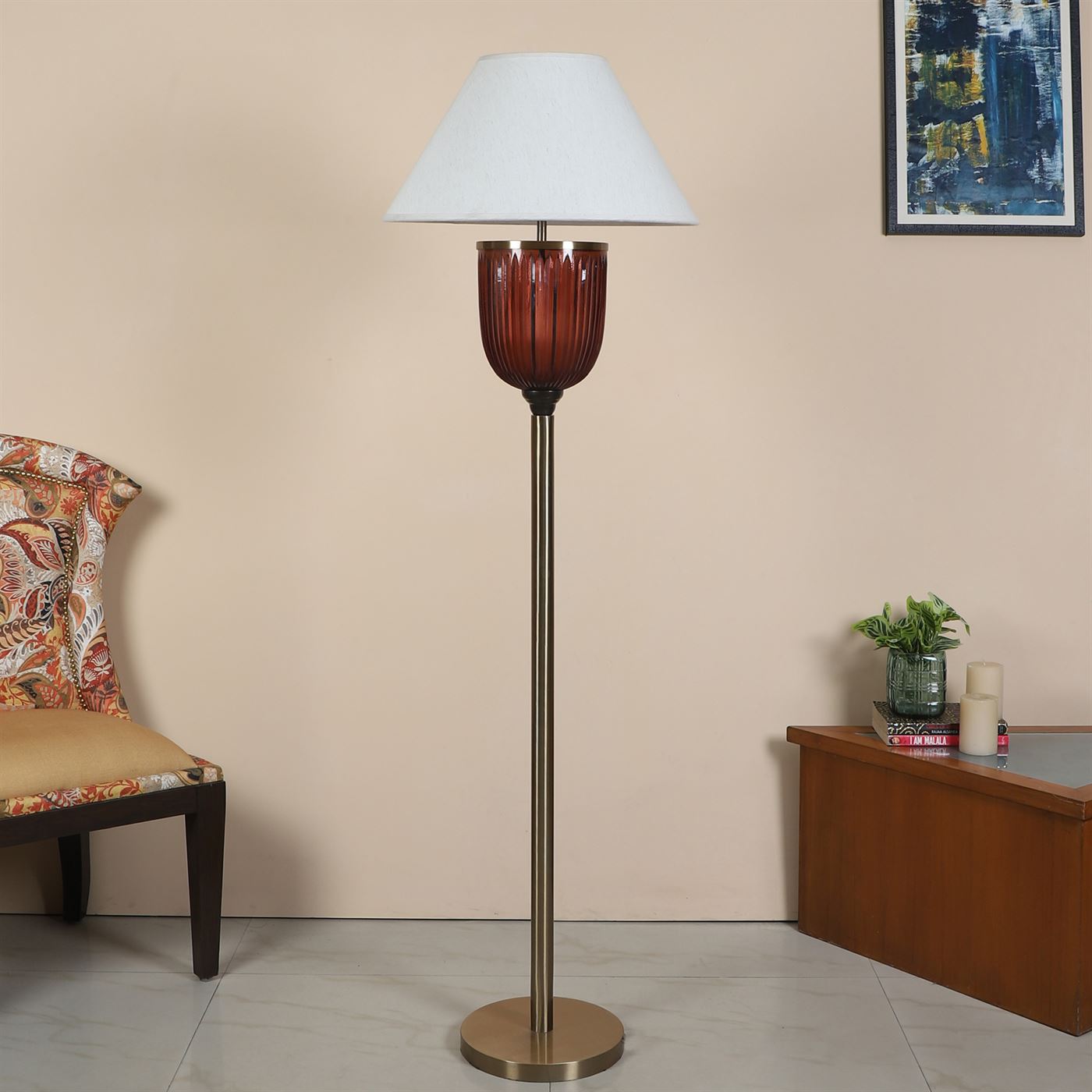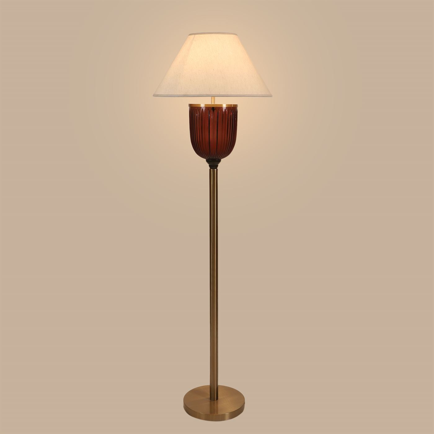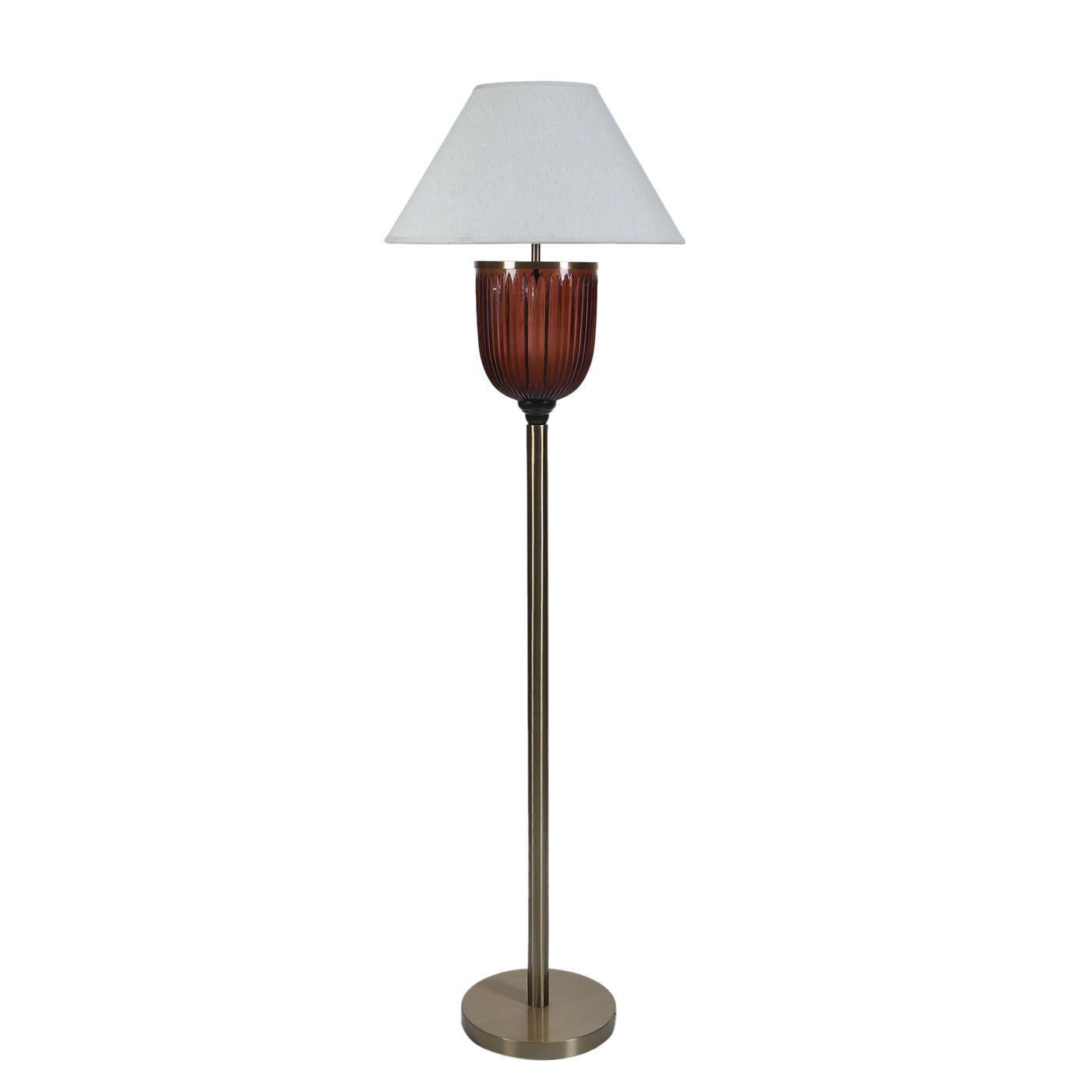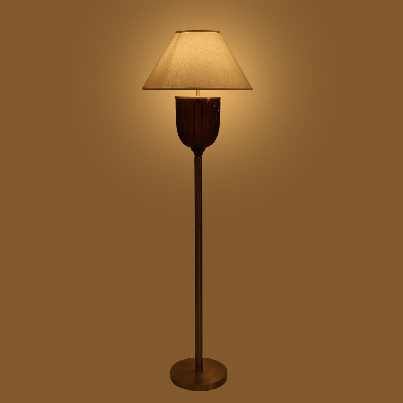 The floor pedestal is a stunning luminaire that meets all your functional and aesthetic requirements. Honey brown crystal glass placed on a metal body finished in matte gold makes for a brilliant addition to your home decor.
